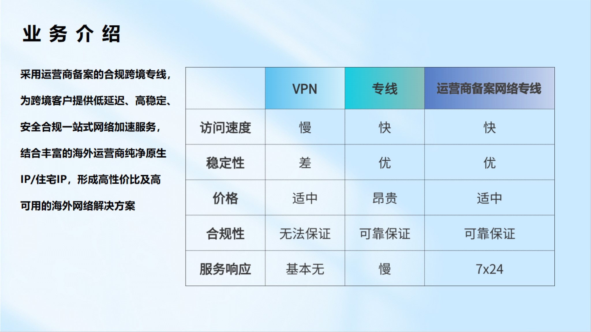 從線路申請、路由優(yōu)化到維護,提供一站式專業(yè)服務,一對一解決問題,專業(yè)營銷團隊一對一定制服務